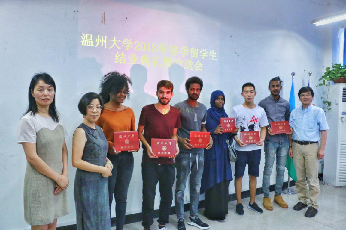 叶苗、陈军、陈文远分别为到场的33位结业学生颁发了结业证书和纪念品。叶苗分别为乌干达籍语言生MBAZIIRA HENRY、泰国籍语言生INTAVAREE MISS CHITCHANOK 颁发了校友联络员证书。最后,叶苗作总结讲话。她代表学院(留管部)对语言生顺利结业表示祝贺,并对他们所取得的进步表示肯定。她说,“在温大学习的每一天都会给你们留下了成长的印记,你们也给温大留下了深刻的印象。你们的名字将永远留在温州大学的校友名录中”。她指出,学习汉语给同学们赋予了外语的力量,有双语和多语能力的人比起单语的人更有优势,有更好的跨语言跨文化交际能力和更开阔的国际视野,同时,她希望同学们为自己所学的外语赋予更强的力量,做更多更有意义的事情,成为自己国家与中国文化交流的友好使者,为两国之间的经济、文化发展做出自己的贡献。最后,她表示,“温州大学欢迎你们常回来看看,温州大学是你们永远的家。”