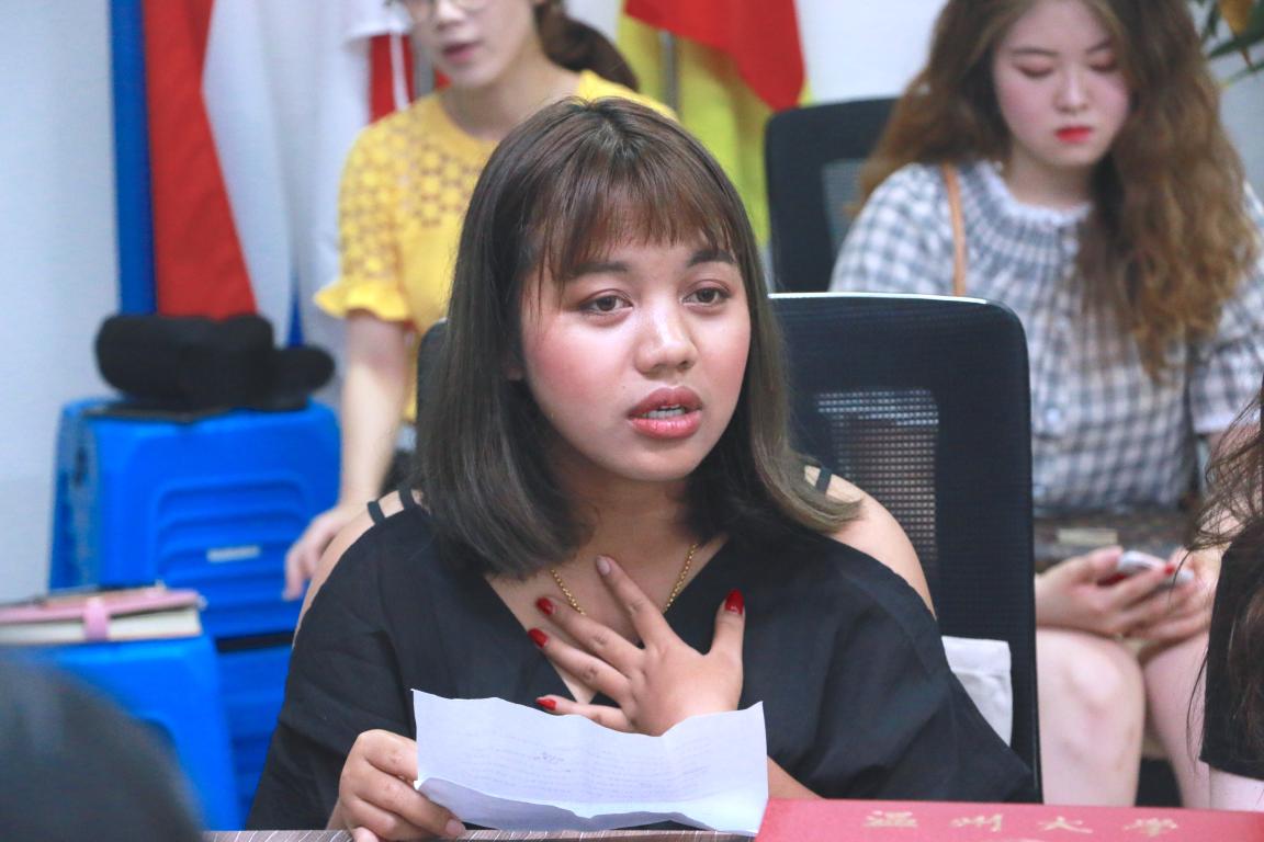 会上,教师代表金碧老师发言,她回顾了语言生们学习生活的点点滴滴,并对他们在汉语学习方面所取得的进步表示充分肯定。她希望他们回国后能继续学习汉语,遇到困难时可以和学院老师多多交流。来自泰国东方大学的交换生张小娴作为学生代表用中文发言。她说自己从小就对汉语学习非常感兴趣,但随着学习的深入,她发现汉语越来越难并一度有放弃的想法,幸运地是她获得了来温州大学学习汉语言的机会,并在这短短8个月里克服了汉语学习的恐惧心里。现在她已经能用中文自信、流畅地交流,她说,“我的成长离不开学院老师和同学对我的帮助,我很感谢温州大学,让我经历了终身难忘的留学生涯。”