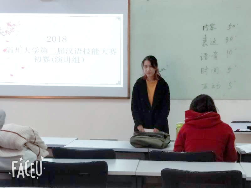 举办,来自韩国、泰国、喀麦隆、意大利、乌干达、埃塞俄比亚等多个国家的留学生参加了本次比赛。本次比赛涵盖演讲、歌唱、朗诵三个类别,分别在不同的教室同时进行。为了确保本次大赛评比的公开、公平、公正性,本次比赛邀请了六位老师作为此次比赛的评委。其中郑婷和金碧两位老师为演讲组的评委,阚文文和徐丽丽两位老师为朗诵组的评委,包含丽和张珉璐两位老师为歌唱组的评委。在比赛开始之前,各位老师首先向学生细致讲解了本次比赛的基本要求和打分细则,并通过抽签的形式确定参赛选手的顺序。