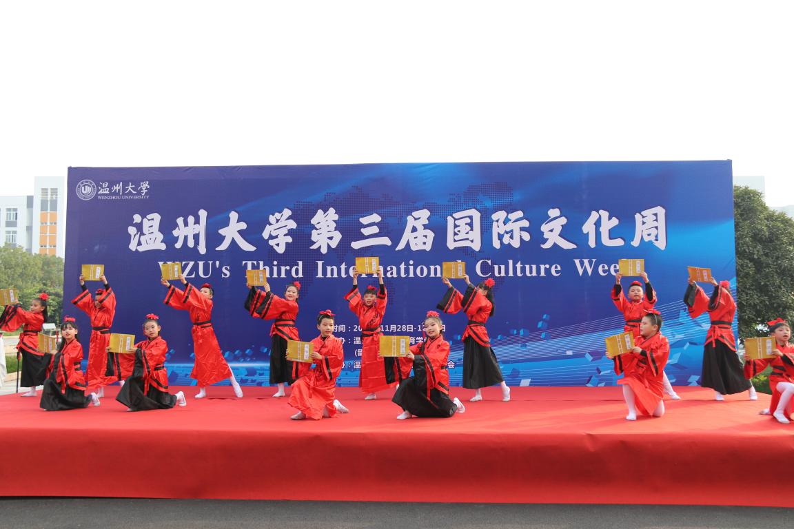 温州市新田园小学是我校国际学生实践基地友好合作学校,来自新田园小学的学生们为观众奉上一场精彩纷呈的表演。《千字文》、越剧《金玉良缘》脍炙人口,小学生们把传统文化的精髓演绎得淋漓尽致。开幕式上,国际学生汉服秀、旗袍秀、多国服装秀、歌舞表演也一一亮相。身穿传统汉服、旗袍的学生们缓缓走来,优雅如初,他们在舞台上行汉代礼仪,诠释他们眼中的中国传统文化。来自韩国、津巴布韦、尼日利亚、埃及等国的25名国际学生带来多国服装秀,各式各样的多国服饰在舞台上依次亮相,引起全场国际学生的共鸣。国际学生们在歌舞方面也不示弱,来自第二届国际学生十佳歌舞大赛获奖选手的精彩表演引起全场的阵阵掌声。