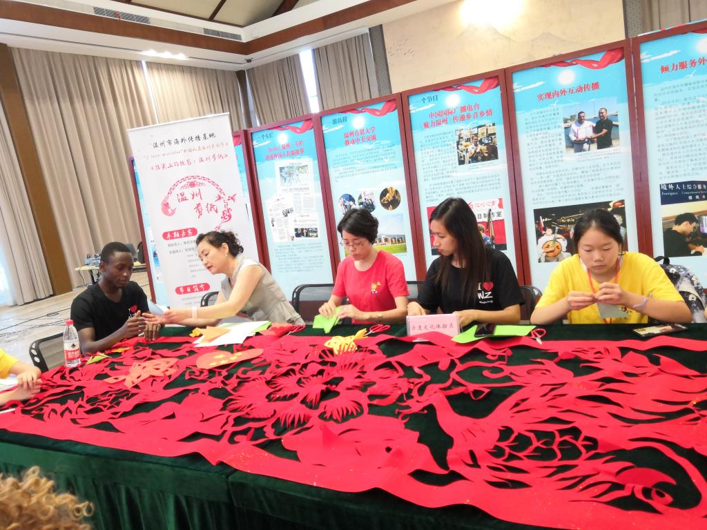 学生们身穿统一的“I Love Wenzhou”主题T恤,聆听在温外籍学生演唱的歌曲《温州是个好地方》,观看了外国友人品尝温州美食及跟随温籍老师学习瓯剧的视频。在活动现场的非遗剪纸体验区,瓯海区非遗剪纸项目代表性传承人张丽丽认真地指导国际学生学习剪纸,教他们剪出一幅幅精美的作品。来自乌兹别克斯坦的SHUKHRATBEKOV ABBOSKHON说,“这是我第一次来到七都街道,这里非常漂亮。在启动仪式上我学会了基本的剪纸技巧,也了解到了独特的温州文化和传统温州美食,我希望以后自己能剪出更多漂亮的剪纸作品,并且走到更多的地方去了解温州的文化和生活方式。”来自津巴布韦的MVUMIRA TASHINGA CECILIA还打算用相机记录自己在温州留学的所见所闻,将视频上传到网络,向世界展示她眼中的温州。