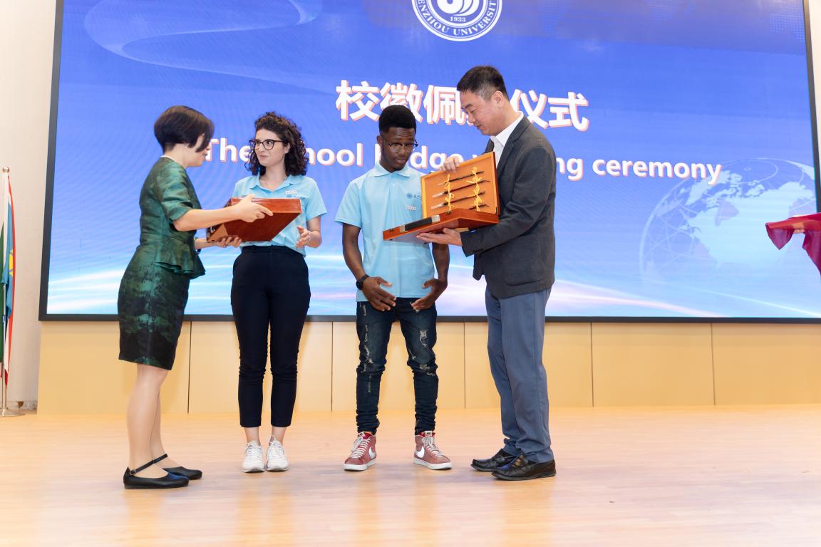 院长叶苗教授为来自意大利和科摩罗的两位国际新生代表佩戴校徽,赠送文房四宝,在场新生同时佩戴校徽,成为真正的“温大人”。