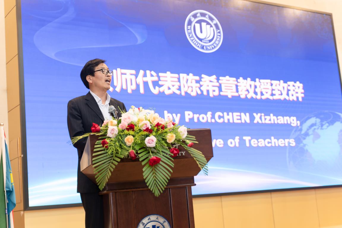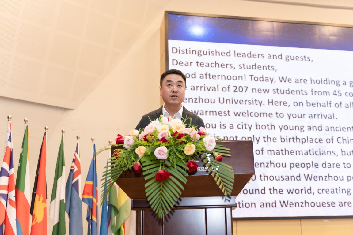 副校长钱强发表致辞,他简要介绍了温州概况及我校发展历史、办学特色和国际化发展现状,勉励同学们珍惜在温大的学习时光,感知中国、认识中国。他希望各位新生能够学习中国文化,用欣赏、包容、互鉴的态度看待世界上不同的文明,成为了解中国文化、胸怀宏大抱负又精通专业的中外交流使者。随后,教师代表陈希章发言,他希望新生努力学习,敢于承担责任,充实而有意义地度过温大留学时光。