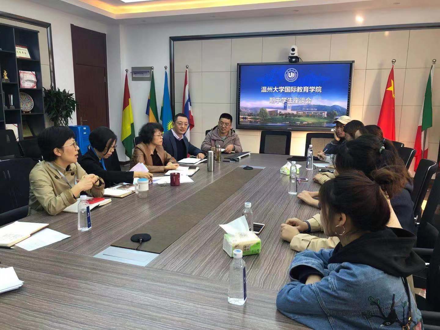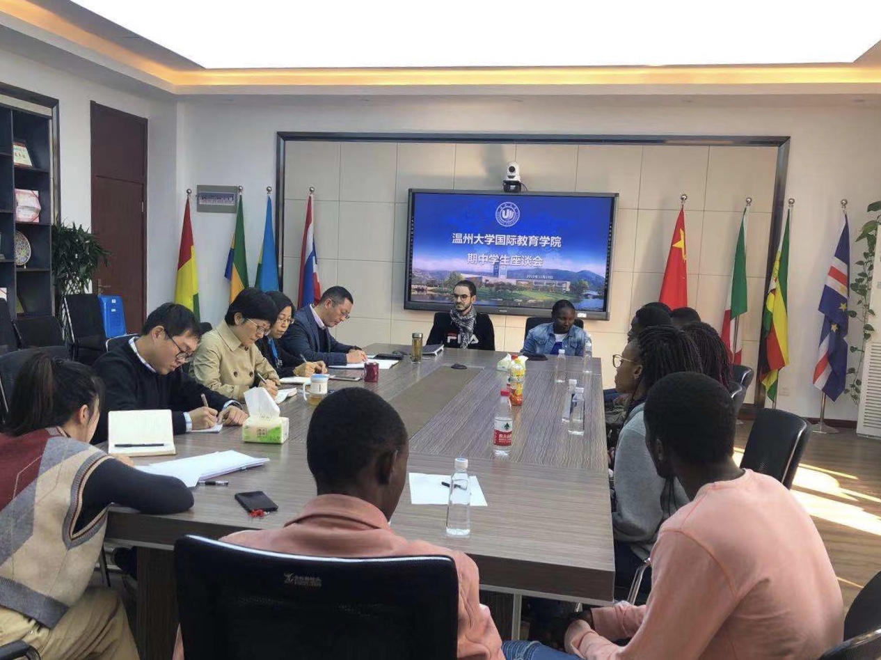2019-2020学年第一学期学生座谈会。此次会议由学院副院长熊勇主持,参加会议的有学院院长叶苗、书记林爱菊、副书记张雪萍、教学科科长许盈盈、学生科科长刘天、其他工作人员和学院国际学生10人、中国学生6人。