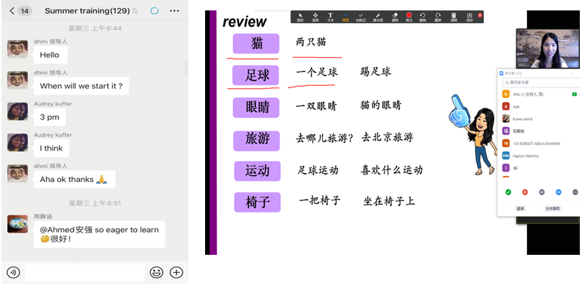本次公益培训的内容主要是在HSK2级的基础上,逐步提升国际学生的汉语水平并通过HSK3级。考虑到已回国的学生因时差带来的不便,培训时间定在每个工作日的下午三点到五点。培训的方式主要是通过使用ZOOM软件在线教学并录下课程供学生回放观看。据悉,早在开课前一天就有120余人加入培训微信群,学生们在微信群里询问上课时间和内容,表现出了极高的学习热情,授课教师也在群里积极地与学生互动答疑。尽管此次培训没有学分的要求和考试的压力,但是学生们还是会按时上课、认真听讲。据授课教师说每次课后作业,学生都会按时提交。根据调查,学生们希望成人网站