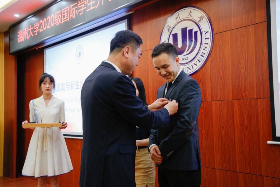 院长叶苗教授为来新生代表佩戴校徽,赠送新生纪念品及汉语学习书籍,在场新生同时佩戴校徽,成为真正的“温大人”。