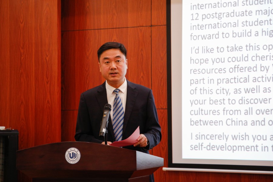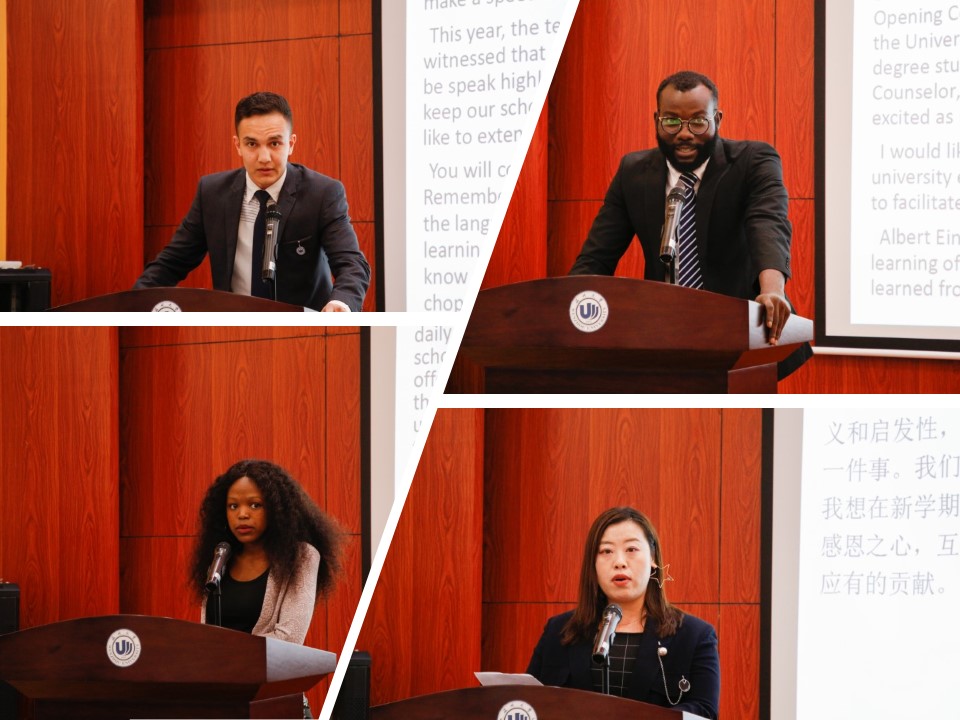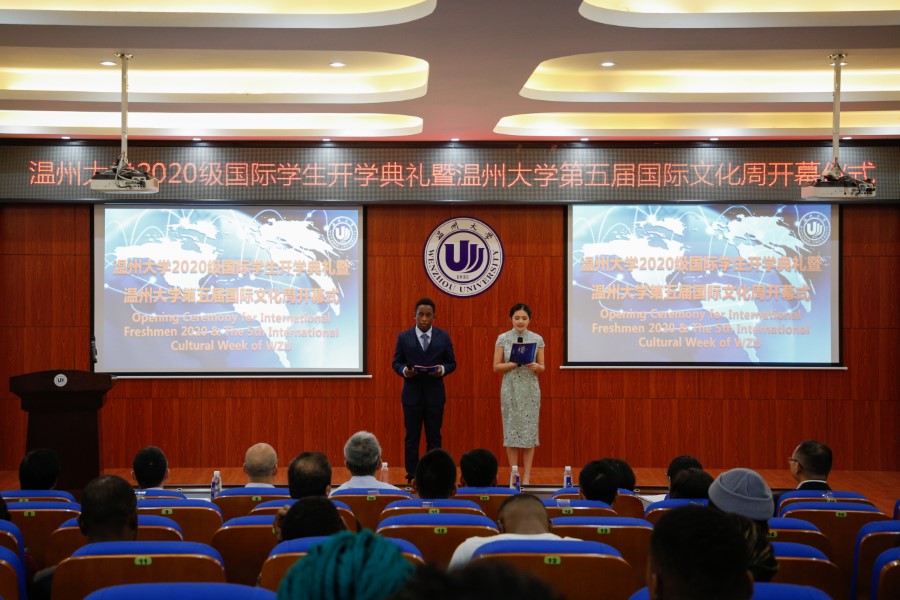 副校长钱强发表致辞,他简要介绍了温州概况及我校发展历史、办学特色和国际化发展现状。在全球人民共同抗击疫情的背景下,他勉励同学们珍惜在温大的学习时光,共同捍卫来来之不易的抗疫成果,他希望各位新生能够学习中国文化,用欣赏、包容、互鉴的态度看待世界上不同的文明,成为了解中国文化、胸怀宏大抱负又精通专业的中外交流使者。随后,国际化教师代表张珉璐发言,她鼓励大家用新的角度看待学习,怀着感恩之心互相帮助,在新学期里共同成长,为世界发展和自我成长做出应有的贡献。在校友代表发言环节,我校优秀校友ADOFO MICHAEL ADJEI为新生致辞发言,他曾是我校计算机专业的研究生,毕业后选择回到温州大学从事国际学生相关工作,他感谢温州大学为他提供的机会与平台,新生应该尽可能地通过学校提供的良好资源发挥自己的潜能。