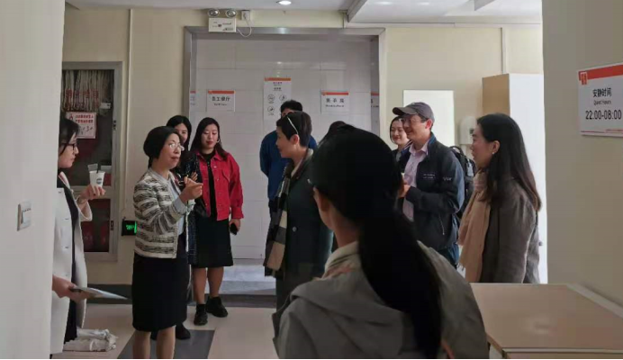 13日上午10:00,叶院长一行到华东师范大学留学生公寓二号楼参观留学生住宿和宿舍文化建设的情况。