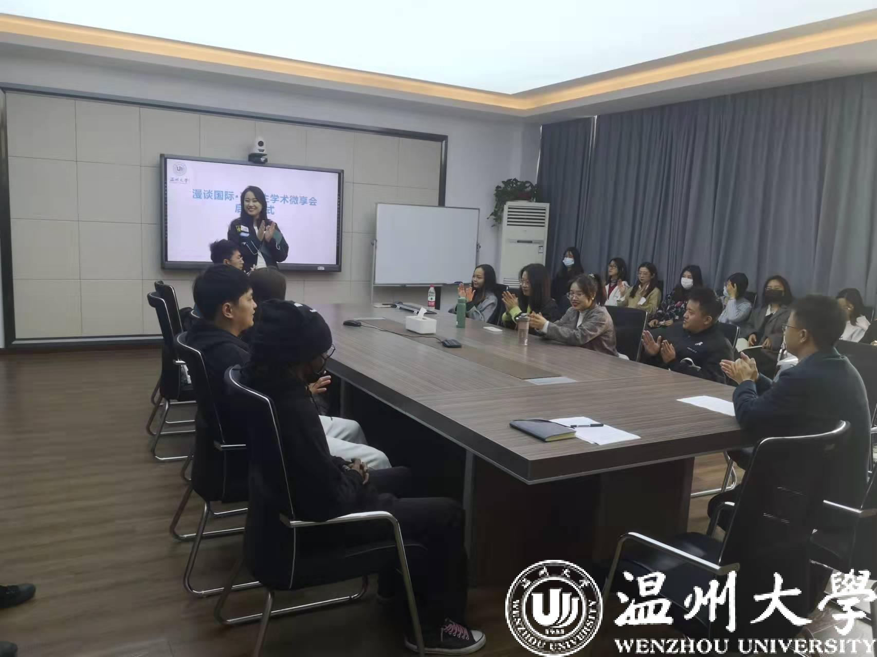 大胆探索,决定举办漫谈国际·研究生学术微享会,从而为研究生的学术交流、经验分享提供一个宽松、自由、平等的交流平台。11月12日下午,学术微享会启动仪式在311会议室成功举行,学院党总支副书记方建晓、辅导员吴铨铨、全体汉硕研究生参加了本次启动仪式。