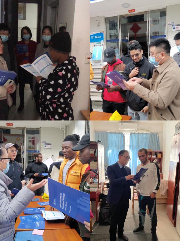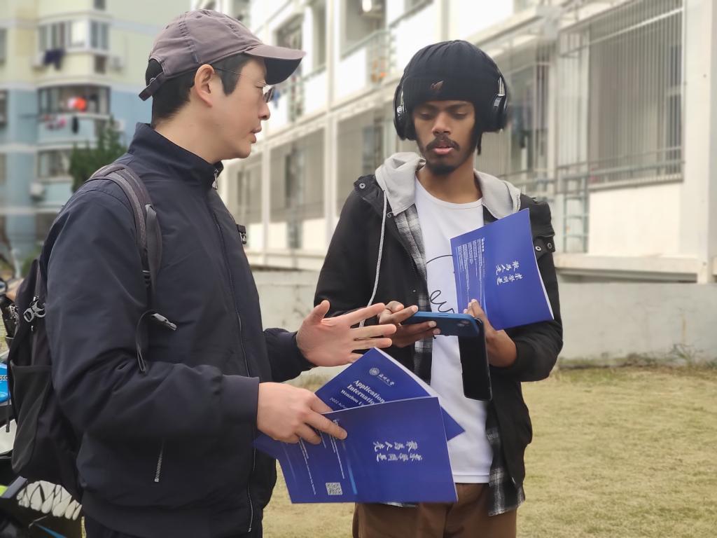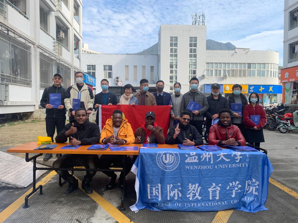 党员们手里拿着《Application Guide for Inernational Students Wenzhou University》小册子,深入国际生寝室,向国际生详细介绍了温州大学国际生的招生政策,涉及硕士项目、本科项目的招生情况以及相关学院、专业名称、学制、授课语言等;讲解了国际生就读的费用情况,包括学费、申请费、住宿费、体检费、保险费、居留许可费;告知了中国政府奖学金、国际中文教师奖学金、浙江省政府奖学金、温州大学国际学生校长奖学金等奖学金情况;耐心传达了资格申请的申请方式,申请时间以及申请所需材料。