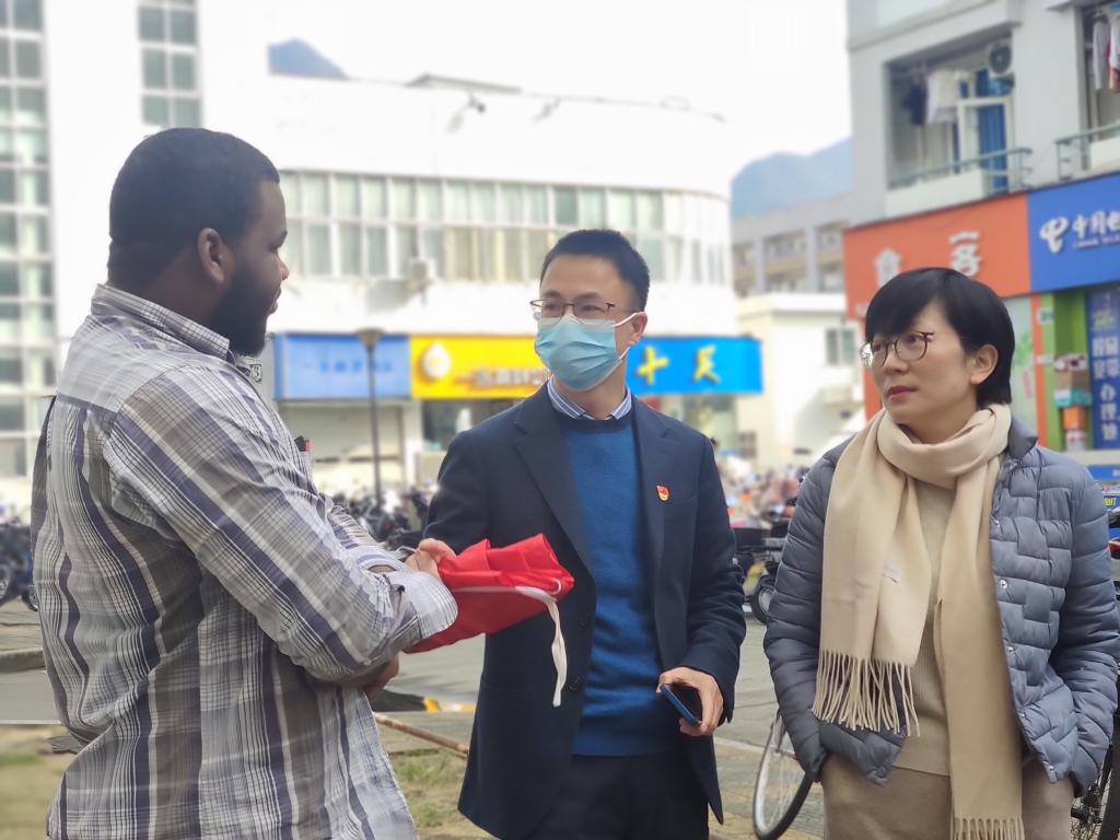 12月22日支部党员们在党总支书记林爱菊带领下奔赴留学生宿舍D区,走进寝室,向国际学生宣传温州大学国际学生招生政策,把招生简章发放到国际学生手中,现场讲解,进行了一场别开生面的主题党日活动。